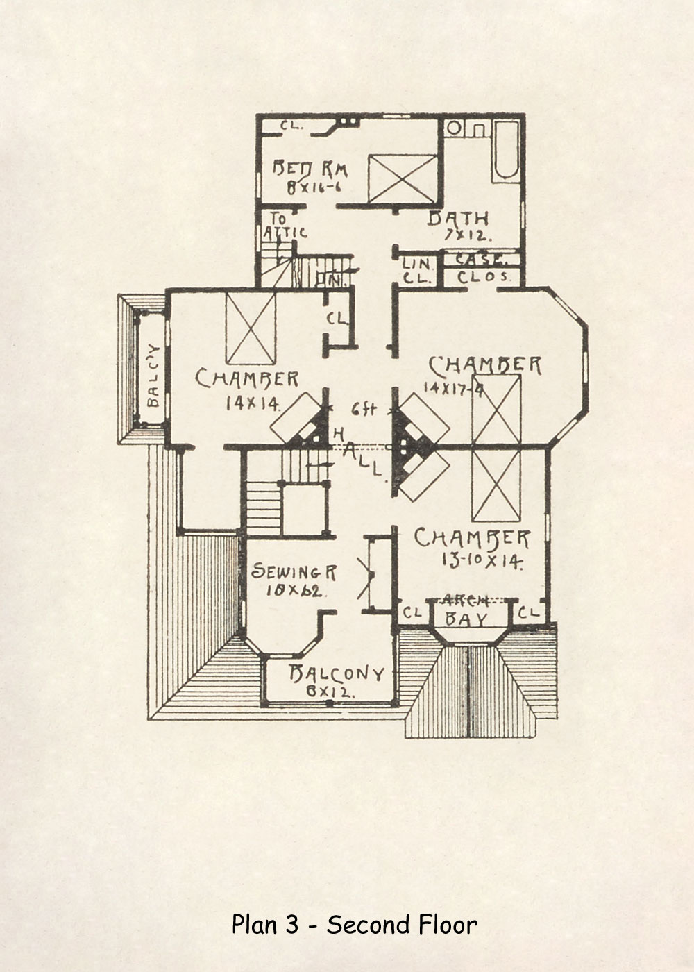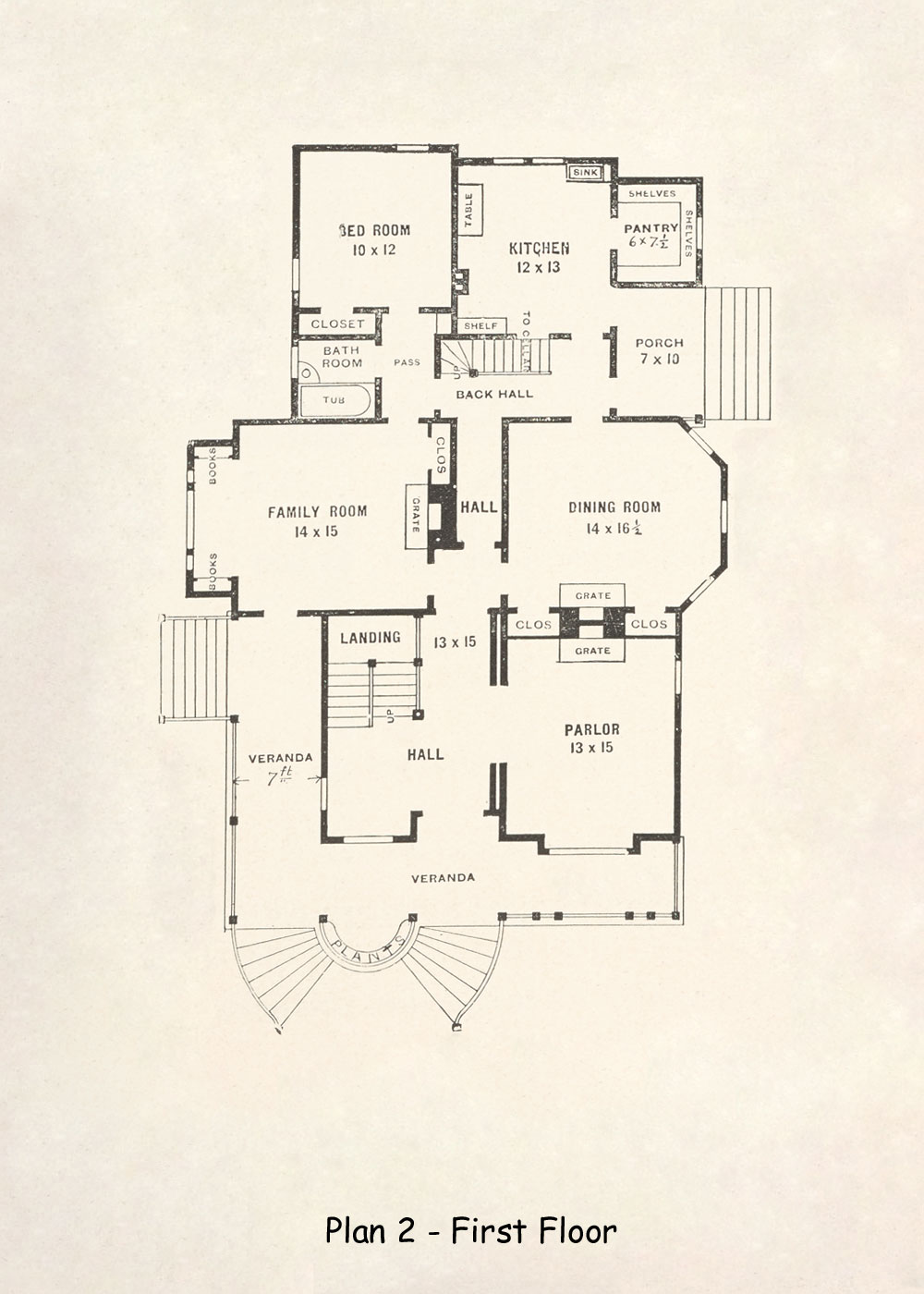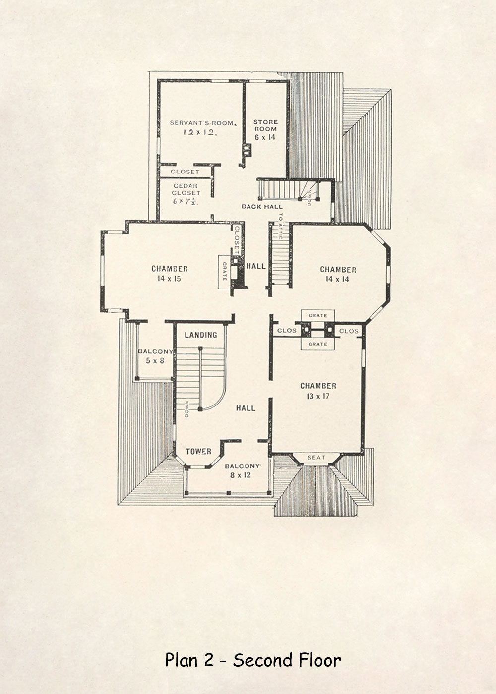For a commodious house we invite close attention to the floor plans of this design. The front hall (with handsome stairway) opens into the parlor, dining and family rooms and by a narrow passage into the back hall, which in turn opens out on to the back porch, into kitchen, back stairs, family room, bath room and bed room. The second story, besides having a beautiful hall, has three large chambers and a servants room, with ample closets to each, a large cedar closet and store room, also a convenient attic stairway. In the family room bay window book cases, with glass doors, are built in either side. A pleasing change in this plan would be to omit the fireplaces and substitute sliding doors between parlor and dining room. The exterior is well proportioned and speaks for itself. The long veranda is richly finished and with its grand entrance way cannot fail to be admired by all. There is a plate-glass window in the hall, and the parlor bay has a horseshoe window, with plate and stained glass. These plans can be enlarged reduced or changed to front in any direction. Interior, Parlor and hall are finished in antique oak; sitting or family room, sycamore; dining room, ash or cherry; front chamber, chestnut. Balance of rooms are to be painted or stained as desired. Plastering, three-coat work, hard finish. Plumbing consists of sink and pump in kitchen, bath tub and bowl, with supply and waste pipe connections, gas throughout. Outside materials, first and second stories clapboarded, belts shingles and wainscoted, gables shingled, roof slated. Iron cresting, galvanized iron gutters, etc. Outside blinds. Painting, three coats. Foundation walls stone, raised pointing. Size, over all except steps, 42 feet x 59 feet 6 inches. Height of stories 10 feet 6 inches each. Depth of cellar, 7 feet, under all up to family and dining rooms.