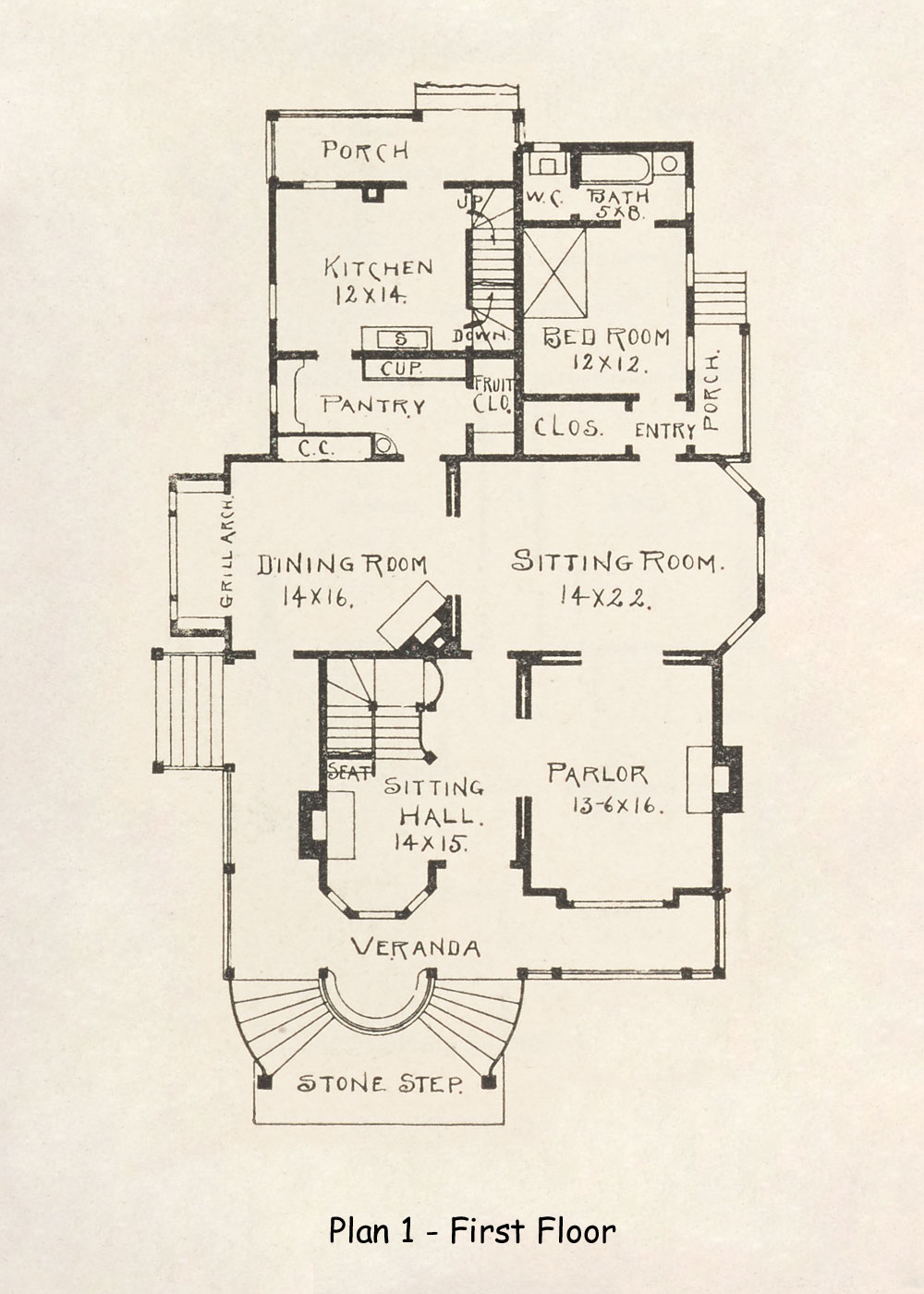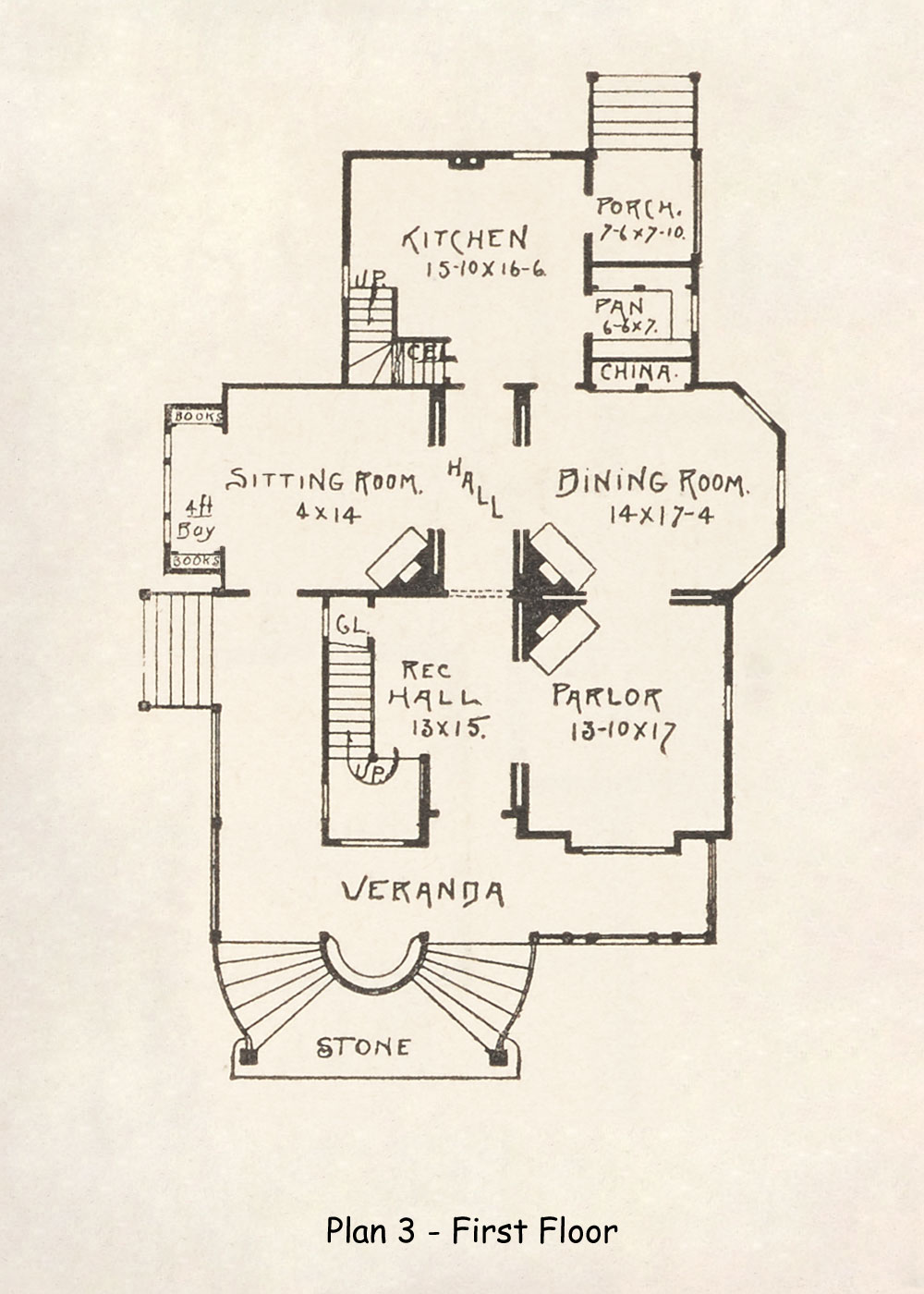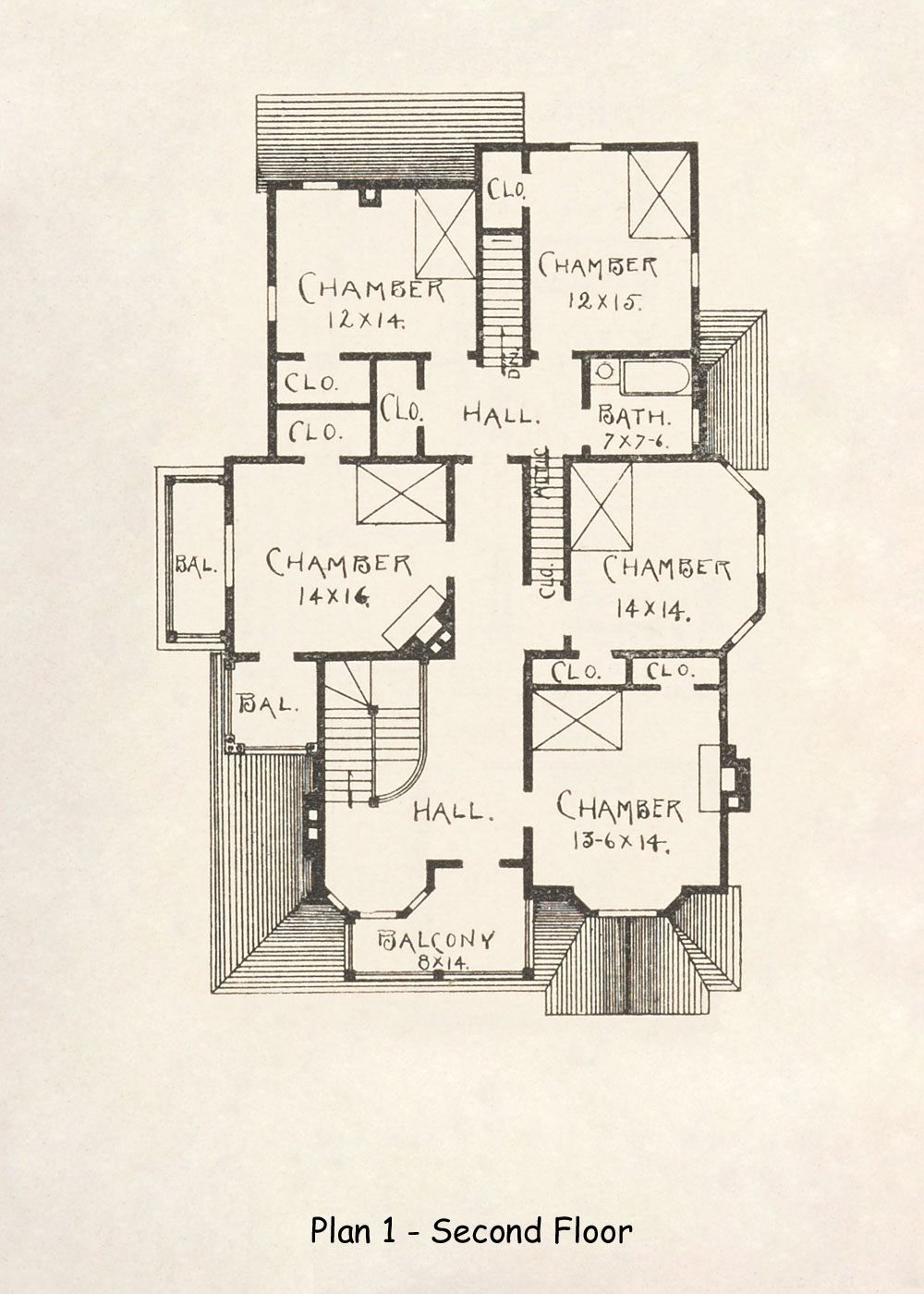 For a commodious house we invite close attention to the floor plans of this design. The front hall (with handsome stairway) opens into the parlor, dining and family rooms and by a narrow passage into the back hall, which in turn opens out on to the back porch, into kitchen, back stairs, family room, bath room and bed room. The second story, besides having a beautiful hall, has three large chambers and a servants room, with ample closets to each, a large cedar closet and store room, also a convenient attic stairway. In the family room bay window book cases, with glass doors, are built in either side. A pleasing change in this plan would be to omit the fireplaces and substitute sliding doors between parlor and dining room. The exterior is well proportioned and speaks for itself. The long veranda is richly finished and with its grand entrance way cannot fail to be admired by all. There is a plate-glass window in the hall, and the parlor bay has a horseshoe window, with plate and stained glass. These plans can be enlarged reduced or changed to front in any direction. Interior, Parlor and hall are finished in antique oak; sitting or family room, sycamore; dining room, ash or cherry; front chamber, chestnut. Balance of rooms are to be painted or stained as desired. Plastering, three-coat work, hard finish. Plumbing consists of sink and pump in kitchen, bath tub and bowl, with supply and waste pipe connections, gas throughout. Outside materials, first and second stories clapboarded, belts shingles and wainscoted, gables shingled, roof slated. Iron cresting, galvanized iron gutters, etc. Outside blinds. Painting, three coats. Foundation walls stone, raised pointing. Size, over all except steps, 42 feet x 59 feet 6 inches. Height of stories 10 feet 6 inches each. Depth of cellar, 7 feet, under all up to family and dining rooms.