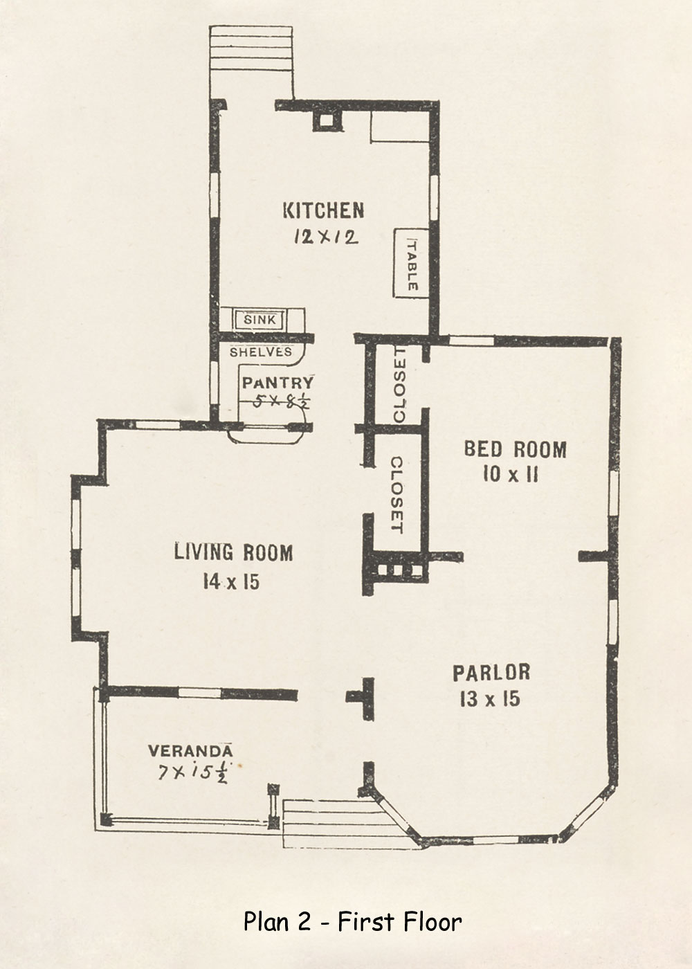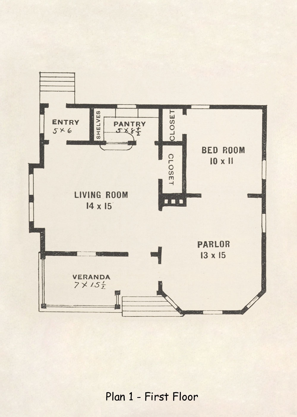 The original Cottage Souvenir publication contained no notes, so the following comes from the Cottage Souvenir No. 2. We have in this a real tasty little cottage, with rooms of ample size and lots of good closets. These plans can be changed in size or made to front in any direction. Outside materials, body of the house is weatherboarded, gables shingled, roof shingled. Foundation, brick. Three coats paint. Outside blinds. The interior is to be finished in pine or poplar, painted three coats. Plastering, three coat work, hard finish. Plumbing includes sink and pump in kitchen, with connections. The two plans are the same, except that No. 2 shows a kitchen room added to the rear. Cost to build, as per description, Plan No. 1, $600 to $800; Plan No. 2, $800 to $1,000. Size, Plan No. 1, 32x27 feet 6 inches; Plan No. 2, 32x40 feet. Height of story, 10 feet. Length of studding, 12 feet.